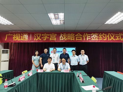 2021年8月17日上午,廣東廣視通科教設(shè)備有限公司與深圳市漢字宮教育科技有限公司戰(zhàn)略合作簽約儀式在廣視通總部二樓會議室舉行。漢字宮董事長高繼成、總經(jīng)理陶建軍、營銷總監(jiān)曹野、技術(shù)總監(jiān)田晨亮、產(chǎn)品總監(jiān)周俊、品宣總監(jiān)向妍;廣視通董事長陳登貴、總工程師王永紅、副總經(jīng)理吳斌華、產(chǎn)品事業(yè)部總經(jīng)理伍業(yè)明等共同參加了戰(zhàn)略合作簽約儀式。