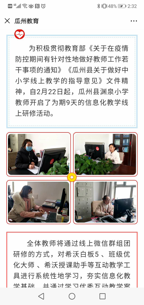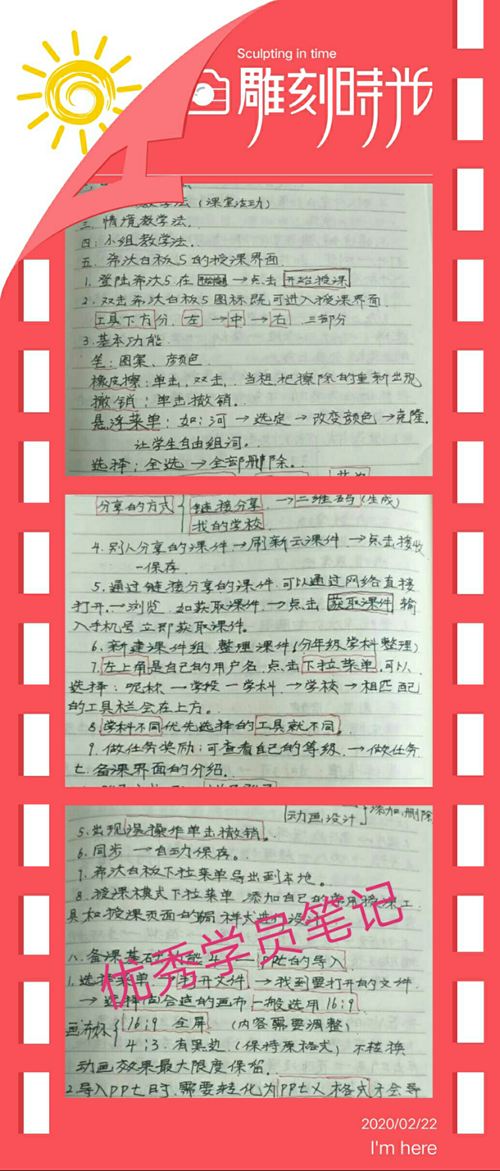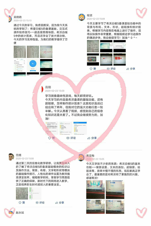 “停課不停學”,不停學的不僅僅是學生,還有眾多的一線教師,他們用行動詮釋著師者的責任和使命。通過線上研修活動,老師們對希沃白板、班級優化大師、希沃授課助手等互動教學工具進行系統學習,通過視頻的方式打卡實操作業,鞏固當天學習的理論知識,檢驗當天學習成果,分享當日學習心得,并通過學習優秀教學案例,促進信息化技術與學科的融會貫通。