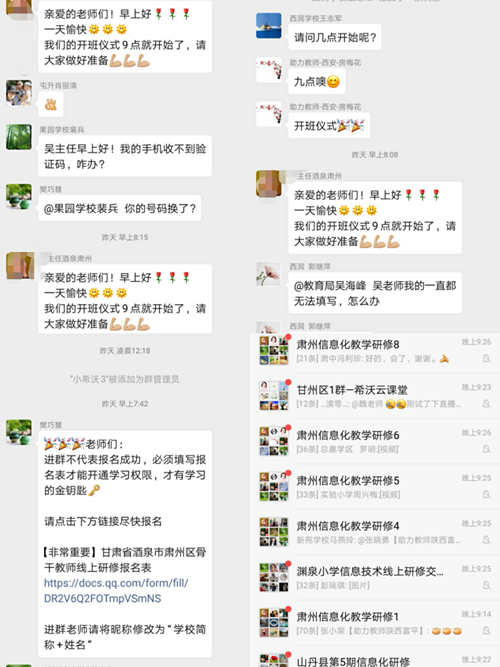 同時,河西走廊的張掖、酒泉、敦煌、嘉峪關、武威等地的數千名老師自發加入希沃云課堂直播培訓的行列。酒泉市教師也自發組建云課堂學習交流微信群,積極學習和討論云課堂的使用方法。這些老師們的積極行為,影響和帶動了周邊6個縣區的老師們也開展云課堂直播學習。疫情肆虐,但阻擋不了身處大漠戈壁的萬千教師的學習熱情。