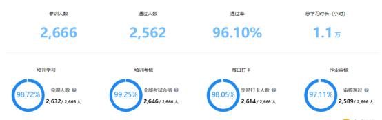 此次培訓獲得河池宜州區(qū)教育局高度重視以及全區(qū)老師的積極響應,截至2020年6月1日,初階培訓取得圓滿的成功,全區(qū)教師累計學習時長共計1.1萬小時,培訓考核通過人數(shù)為2562人,考核成功率超96%,此次培訓達到預定目標,基本實現(xiàn)老師能夠通過培訓掌握交互式課件制作的要求。
