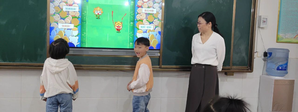 經(jīng)過一段時(shí)間培訓(xùn)后,李健飛使用希沃白板上了幾次示范課。在課堂上,她讓兩位孩子到講臺(tái)上玩分組競(jìng)爭(zhēng)的趣味游戲,其余孩子會(huì)自覺為小伙伴喊加油,課堂氛圍一下子活躍了起來。這時(shí)老師們才發(fā)現(xiàn),丟棄粉筆的課堂,可以這么趣味十足。原來孩子們也會(huì)喜歡上課,也會(huì)全神貫注參與到課堂互動(dòng)中。