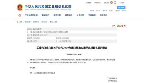 2019年工信部為貫徹落實《中華人民共和國標準化法》的要求,大力培育發展團體標準,支持團體標準的推廣應用,對實施6個月以上,且技術水平較高、應用效果較好,對促進工業通信業質量品牌提升、推動產業高質量發展具有較強引領作用,具備較好的系統性和體系性的應用示范項目;對具有創新性、先進性和國際性的團體標準應用示范給予重點支持。