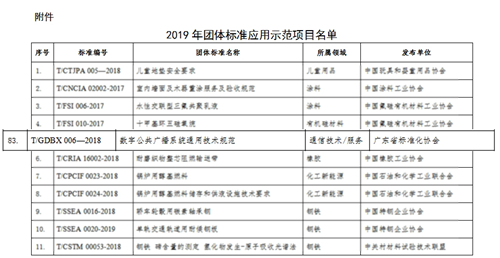 經社會團體自愿申報、地方或行業推薦、專家審查和社會公示等環節,遴選出103項2019年團體標準應用示范項目,其中,itc主編《數字公共廣播系統通用技術規范》通過遴選從眾多申報團體中脫穎而出,順利入圍2019年團體標準應用示范項目名單。