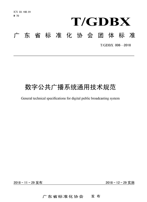 2018年12月itc主編的《數字公共廣播系統通用技術規范》率先通過了廣東省標準行業協會的專家評審,并于2018年12月29日實施。