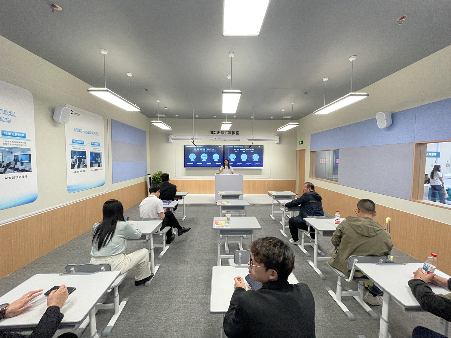 itc教室擴聲系統,采用AI大模型,智能識別環境聲場,利用自學習調節技術,使環境達到最好的聲場狀態,有效提升教學擴聲質量,同時自動調試算法避免了安裝與運維的復雜性。業內首創運用AI降噪消除非穩態噪聲,相較于傳統降噪算法,能更好地濾除瞬態噪聲,包括拍手、開門、翻書等;AI語音檢測,為教學場景構建零干擾的聲學基底;應用多通道獨立自適應反饋控制(AFC)擴聲算法,多種調音模塊實現靈活聲學管控,克服聲學混沌,適應更復雜環境。