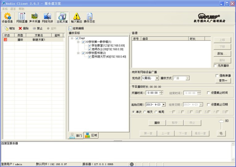 產品詳細介紹1、標準TCP/IP網絡協(xié)議,軟件包帶有服務器軟件(含定時任務、消防報警、無線遙控、外部采播、斷網打鈴、終端饋送、電話廣播、可任意多次使用的分控軟件等多個部分);系統(tǒng)可在同網段的局域網內、跨網關的局域網內以及Internet網上使用。即在總部配置上相關的設備及軟件,可以通過INTERNET網對各分部進行遠程廣播通知等功能,支持多級服務器(適合廣域網大型項目); 2、負責音頻流點播服務、計劃任務處理、工作站分控軟件管理和權限管理等功能。為所有數(shù)字IP網絡廣播音頻終端提供定時播放和實時點播服務,響應各終端、遠程尋呼終端的播放請求,為工作站分控軟件提供數(shù)據(jù)接口服務; 3、HAYU哈宇IP網絡廣播音頻服務器控制軟件可將傳統(tǒng)音頻資源,轉換成數(shù)字節(jié)目存儲到系統(tǒng)服務器的節(jié)目庫中(可以容納萬首節(jié)目),方便用戶今后任意利用和同時使用,可連續(xù)一周無重復播放; 4、帶有檢測功能,可以實時監(jiān)測任意一個終端節(jié)點的使用狀態(tài); 5、系統(tǒng)支持模擬音源實時輸入,將模擬音源實時數(shù)字化,實現(xiàn)任意多路實時采播; 6、具有定時自動開關機功能,能定時開關電腦、工控主機以及所有設備的定時開關; 7、系統(tǒng)具有傳統(tǒng)和網絡廣播兩套系統(tǒng)共存功能,當網絡廣播出現(xiàn)故障時,可自動切換到模擬系統(tǒng)進行廣播,音箱仍然利用IP網絡廣播系統(tǒng)的音箱,無需再布置; 8、IP網絡服務器控制軟件是整個系統(tǒng)的運行核心,采用后臺系統(tǒng)服務運行,開機系統(tǒng)即可自動運行; 9、系統(tǒng)軟件支持Windows2000、WINDOWS2003、Windows XP、Windows7等多個系統(tǒng)平臺; 10、系統(tǒng)軟件具有雙保險功能,可設置主服務器以及備份服務器,當主服務器故障或感染病毒時,備份服務器可自動接替主服務器進行工作,提高了系統(tǒng)的穩(wěn)定、可靠性; 11、服務器軟件支持第三方平臺嵌入式開發(fā),提供SDK第三方軟件開發(fā)包,實現(xiàn)與大系統(tǒng)、大平臺的系統(tǒng)整合; 12、系統(tǒng)軟件集成了多個常用監(jiān)控品牌(海康、大華、漢邦等)的SDK開發(fā)包,在應用于IP網絡對講系統(tǒng)時,直接實現(xiàn)與監(jiān)控系統(tǒng)進行實時聯(lián)動功能; 13、系統(tǒng)軟件具有廣播監(jiān)聽功能、報警聯(lián)動、無線遠程控制、電話接入控制、節(jié)目源和數(shù)據(jù)不受限制、站點無限,擴容簡便; 14、支持單點播放:可以對任意單點、組群、分區(qū)或全部廣播; 15、具有自動音樂打鈴、定時節(jié)目播放、音頻實時采播,可以實現(xiàn)定時定點定區(qū)域定曲目播放,實現(xiàn)無人值守功能,系統(tǒng)能根據(jù)廣播音頻信號的有無可以自動關閉、開啟各個節(jié)點上的功放; 16、軟件具有全雙工雙向對講、對講自動錄音、對講日志、網絡話筒自動排隊、來電提醒、占線等待及轉接等功能; 17、具有遠程分控講話、分區(qū)自由點播、網上電臺轉播、尋呼對講錄音功能; 18、系統(tǒng)具有音頻終端斷網自動打鈴、自動定時更新終端斷網打鈴定時程序功能; 19、軟件具有終端饋送演講功能:可任意指定一個終端做為廣播音源,把此終端本身自帶線路、話筒音源實時編碼成數(shù)字音頻流廣播到其它任意多個終端; 20、系統(tǒng)可以同時向各個網絡節(jié)點傳送多路音頻,可以外接傳統(tǒng)音源信號與文件音源相結合的形式進行傳輸,即每路音頻所占用帶寬不大于100KBPS,軟件支持WINDOWS支持的所有音頻格式(MP3、WAV等); 21、軟件具有消防聯(lián)動報警功能,能接收并處理消防中心信號,按照預先設置,使廣播系統(tǒng)發(fā)出報警語音的軟件;可支持臨層、全區(qū)報警、分區(qū)報警等多種報警模式;內置報警語音播放模塊和報警語音采集模塊,可播放預存的報警語音或采集外部報警語音; 22、客戶端分控軟件利用IP網絡(局域網、廣域網)遠程登錄到服務器,實現(xiàn)遠程管理。主要完成音頻實時采播、節(jié)目資源管理和定時編排播放功能,通過授權在分控軟件上可以直接對服務器的廣播定時任務進行編輯、修改。將話筒接入工作站分控電腦聲卡,可以實時采集壓縮后廣播到各數(shù)字音頻終端,不需廣播主控室人工干預;遠程管理服務器的節(jié)目庫,可以將制作的音頻節(jié)目上傳,遠程添加刪除文件; 23、軟件可設置戶外型帶LED顯示屏IP終端機空閑時顯示的文字,可設置三幅文字循環(huán)顯示; 24、具有頻道設置管理功能,即可對帶外控操作面板的IP終端設置相應頻道號及設置各頻道音頻文件等功能; 25、軟件具有考試模式功能,在考試時將此項選擇,可以禁止用戶登記以及用戶編輯的定時任務運行,以確保考慮的順利進行,同時操作簡單、快捷。 數(shù)字IP網絡廣播分控軟件:可以根據(jù)服務器授權級別不同來進行不同級別的控制,※IP網絡廣播分控軟件具有定時任務編程功能:在各分控軟件上可以對廣播的定時任務進行編輯,以方便學校系統(tǒng)管理員的管理。數(shù)字IP網絡廣播分控軟件:可以根據(jù)服務器授權級別不同來進行不同級別的控制,※IP網絡廣播分控軟件具有定時任務編程功能:在各分控軟件上可以對廣播的定時任務進行編輯,以方便學校系統(tǒng)管理員的管理。 |
