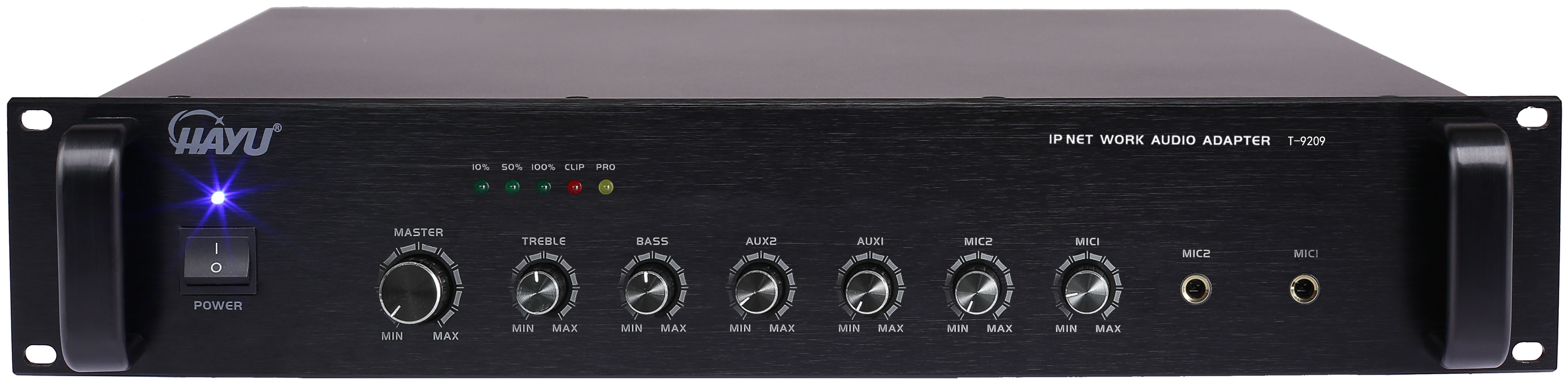 產品詳細介紹采標配1個10/100M RJ45網絡交換機接口,支持局域網與廣域網; 采用固定靜態的IP地址,當網絡發生改變時地址不會丟失,工作穩定; 設備采用嵌入式計算機技術和DSP音頻處理技術設計; 設有2路本地線路輸入,2路話筒輸入接口,1路音頻輸出,每路設有獨立音量可調,并帶有高低音與總音量調節; 采用先進高效功率放大電路,足功率輸出,工藝簡潔美觀;設有單向點播功能,可通過服務器軟件、對本終端自由點播服務器中節目; 音頻文件支持MP3,WMA,OGG,等格式,廣播最高可位速率:192K/S(44.1,16),點播最高可位速率320K/S(44.1,16),音頻硬解碼; 自帶1路電源管理,可實現定時、手動打開及有線路或話筒信號輸入時自動開機; 設有3級優先功能,報警為最高優先級,網絡音頻播放為第二級、本地播放為第三級; 設有功放接通電源指示燈、功放保護指示燈、功放工作信號及消峰指示燈; 功率輸出設有70V/100V定壓輸出,及4-16Ω定阻輸出; 輸出頻響范圍為100~16KHz; 設備設有異常工作保護警告功能,當輸入信號過大、負載過重、溫度過高、線路短路時,對應的指示燈提示,有極高的可靠性。 2U標準機箱設計,鋁合金面板,美觀實用。 產品技術參數: 網絡接口:標準RJ45;傳輸速率:0M/100Mbps;音頻格式:MP3/MP2;音頻模式:16位立體聲CD音質;輸出頻率:20Hz—20KHz;采樣率:8K~48KHz;支持協議:TCP/IP、UPP,IGMP(組播);諧波失真:≤0.3%;信 噪 比:≥90dB;線路輸入電平:250mV;MIC 輸入靈敏度:10mV;線路輸出電平、阻抗:775MV、1KΩ;短路接口:1路:控制帶后控功放;工作環境:工作溫度 :-20℃~+60℃;工作濕度: 10%~90%;電源電壓:AC220V 50HZ;T-9210的額定輸出功率:120W;保險絲5A;重量:8.5KG;產品尺寸:485*88*340mm。 |