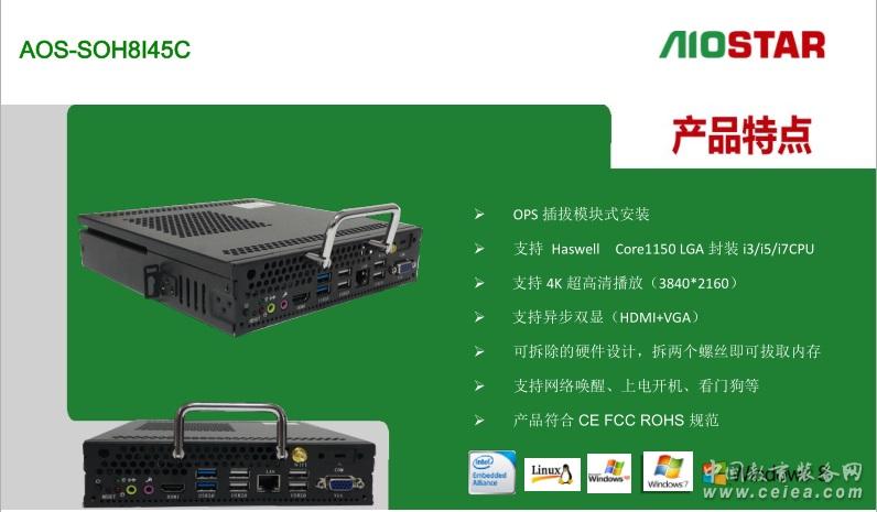 1概述編輯 Aiostar OPS 全稱為:Aiostar Open Pluggable Specification,開放式可插拔規(guī)范。是Intel與顯示器廠商共同制定的標(biāo)準(zhǔn)化數(shù)字標(biāo)牌接口規(guī)范。OPS內(nèi)部組成是一個(gè)X86架構(gòu)的迷你PC,采用英特爾酷睿處理器,配有內(nèi)存、硬盤、多種輸入輸出接口以及Windows操作界面,尺寸為200mm x 119mm x 30mm 。 以下為Intel 官網(wǎng)對于OPS的定義: 原文如下: Digital Signage Open Pluggable Specification :Simplify digital signage development Highlights Enables easier installation, use and maintenance of digital signs. Makes digital signage devices more intelligent and connected. Overview The open pluggable specification (OPS) helps standardize the design and development of digital signage devices and pluggable media players. Intel created OPS to address digital signage market fragmentation and simplify device installation, usage, maintenance and upgrades. OPS enables digital signage manufacturers to deploy interchangeable systems faster and in higher volumes, while lowering costs for development and implementation. Installing digital signage equipment based on Intel architecture helps you implement scalable digital signage applications that can network easily with other equipment. This simplifies interoperability and application upgrades designed to meet the digital signage requirements of individual customers, while helping to future-proof technology investments.[1] 譯文: 強(qiáng)調(diào) 更便于安裝、使用和維護(hù)的數(shù)字信號。 使數(shù)字看板設(shè)備更智能和融合。 概述 開放的可插拔的規(guī)范(OPS)有助于規(guī)范的設(shè)計(jì)和開發(fā)數(shù)字看板設(shè)備,并插入媒體播放器終端。Intel創(chuàng)造OPS 致力于數(shù)字看板市場分化和簡化設(shè)備安裝、使用、維護(hù)和升級。 OPS可以使數(shù)字看板制造商更快部署大量的交互系統(tǒng),同時(shí)降低開發(fā)和實(shí)現(xiàn)的成本。 安裝基于英特爾架構(gòu)的數(shù)字標(biāo)牌設(shè)備可以幫助您實(shí)現(xiàn)可伸縮的數(shù)字看板應(yīng)用程序,并且很容易和其他設(shè)備進(jìn)行網(wǎng)絡(luò)連接。這簡化了通過交互和升級的設(shè)計(jì)來滿足個(gè)人客戶的數(shù)字看板需求,同時(shí)有利于面向未來的技術(shù)投資。 2特點(diǎn)編輯 1、支持?jǐn)?shù)字標(biāo)牌等行業(yè)最新的OPS規(guī)范的電腦模塊,加速數(shù)字標(biāo)牌行業(yè)的標(biāo)準(zhǔn)化趨勢。 2、OPS模塊可以簡化設(shè)備的安裝、使用、維護(hù)和更新,幫助數(shù)字標(biāo)牌制造商降低開發(fā)和實(shí)施成本。 3、OPS可簡便地與其它設(shè)備聯(lián)網(wǎng),可擴(kuò)展數(shù)字標(biāo)牌應(yīng)用,滿足數(shù)字標(biāo)牌對交互和應(yīng)用更新的需求。 4、部分OPS平臺(tái)支持遠(yuǎn)程管理及低功耗模式,解決耗電及散熱要求。同時(shí)平臺(tái)所支持的Intel vPro、AMT遠(yuǎn)程管理技術(shù),實(shí)現(xiàn)設(shè)備無人操控下的高效運(yùn)作。如采用四代i5+Q87平臺(tái)的AOS-SOQ8I45A 5、OPS無風(fēng)扇散熱設(shè)計(jì),提供超靜音的解決方案,保證工作環(huán)境的安靜、清爽。發(fā)熱量小也帶來了較小的功耗。 3整機(jī)編輯 Intel 2011年提出該規(guī)范后,伴隨著日本NEC OPS接口顯示器的上市,傳統(tǒng)數(shù)字標(biāo)牌嵌入式主板走下神壇,OPS模塊化正式開啟。代表作品有 愛鑫微電子(AIOSTAR) AOS-SOH8I45A ,