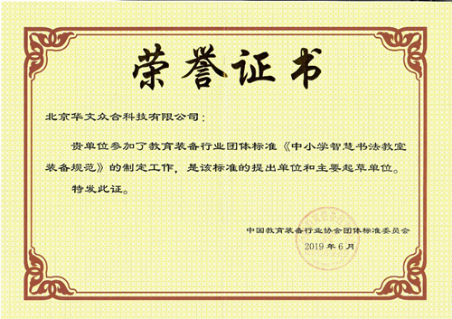 繼6月初《中小學(xué)智慧書法教室裝備規(guī)范》團(tuán)體標(biāo)準(zhǔn)發(fā)布之后,北京華文眾合科技有限公司于日前獲得中國教育裝備行業(yè)協(xié)會(huì)頒發(fā)的榮譽(yù)證書,華文眾合是《中小學(xué)智慧書法教室裝備規(guī)范》團(tuán)體標(biāo)準(zhǔn)的牽頭制定單位,是該標(biāo)準(zhǔn)的提出單位和主要起草單位。