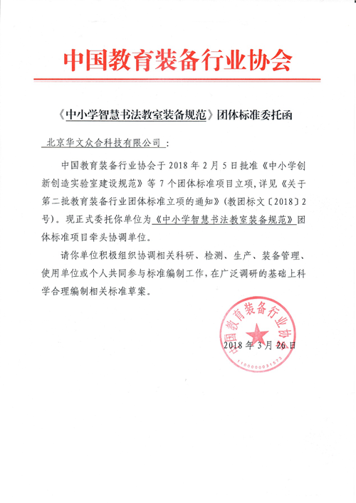 《中小學(xué)智慧書法教室裝備規(guī)范》團(tuán)體標(biāo)準(zhǔn)于2018年2月5日批準(zhǔn)立項(xiàng)。2018年3月26日,中國教育裝備行業(yè)協(xié)會(huì)發(fā)文委托華文眾合為《中小學(xué)智慧書法教室裝備規(guī)范》團(tuán)體標(biāo)準(zhǔn)的牽頭制定單位。