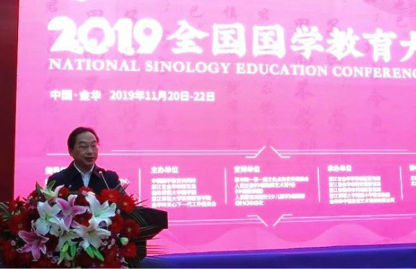 11月21日,由中國國學(xué)教育共同體、浙江省金華市教育局、曲阜師范大學(xué)國學(xué)院、浙江師范大學(xué)教師教育學(xué)院、金華市關(guān)心下一代工作委員會主辦的“2019全國國學(xué)教育大會”在婺城金華隆重舉行。原文化部副部長潘震宙,中國留學(xué)發(fā)展人才基金會漢學(xué)研究院院長張健,孔子七十五代孫、世界儒學(xué)大會秘書長、中國孔子研究院副院長孔祥林,教育部原國家督學(xué)、教育部《中小學(xué)書法教育指導(dǎo)綱要》研制組專家、華文眾合書畫研究院專家張鳳民等領(lǐng)導(dǎo)出席會議,來自全國12個省的280余名國學(xué)教育專家學(xué)者共同參會。
