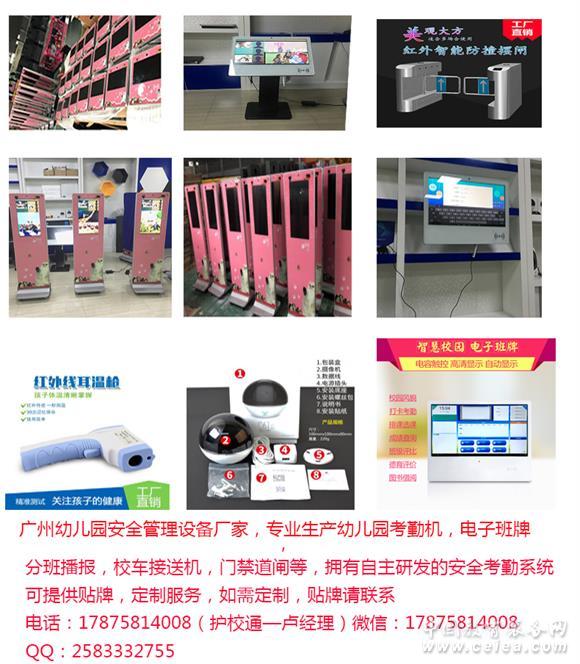 產(chǎn)品詳細(xì)介紹廣州護(hù)校通專業(yè)校園安防廠家,主要為各大營(yíng)銷公司和校園,提供校園安防設(shè)備和定制生產(chǎn)業(yè)務(wù)。主營(yíng)產(chǎn)品有幼兒園打卡機(jī),電子班牌,道閘,校車刷卡機(jī),分班播報(bào)等。 護(hù)校通經(jīng)營(yíng)校園安防設(shè)備多年,經(jīng)驗(yàn)豐富,能及時(shí)處理產(chǎn)品問(wèn)題。擁有4000方生產(chǎn)廠房,分為生產(chǎn)車間和組裝車間,配備大型生產(chǎn)設(shè)備,廠房有著專業(yè)的生產(chǎn)團(tuán)隊(duì)和組裝團(tuán)隊(duì),員工達(dá)100多人。護(hù)校通有著一套完善的生產(chǎn)管理體系,生產(chǎn)效率高,產(chǎn)品質(zhì)量一流。護(hù)校通還有300方獨(dú)立營(yíng)銷中心,有著專業(yè)軟件技術(shù)人員,銷售,售后團(tuán)隊(duì)能為客戶提供全方位的服務(wù)。 護(hù)校通產(chǎn)品系列豐富,幼兒園打卡機(jī)有三大安裝方式(壁掛式,立式弧度,立式)四大尺寸(10.1寸15.6寸21.5寸32寸) 幼兒園打卡機(jī)功能詳情: 1、刷卡接送:采用先進(jìn)的非接觸式 IC智能卡技術(shù),作為接送人員標(biāo)識(shí),刷卡提高了接送幼兒的安全性,持無(wú)效卡接送系統(tǒng)將出現(xiàn)報(bào)警。 2、顯示接送人照片:幼兒離園時(shí)由接送人在刷卡設(shè)備上進(jìn)行刷卡,系統(tǒng)將顯示兒童和接送的信息與照片,幫助門衛(wèi)分辨接送人是否為幼兒家屬。 3、拍照記錄:護(hù)校通刷卡機(jī)裝配有高清攝像頭,接送人在刷卡設(shè)備上進(jìn)行刷卡時(shí),系統(tǒng)會(huì)自動(dòng)拍照存儲(chǔ),持無(wú)效卡刷卡,無(wú)任何反應(yīng)。 4、幼兒信息管理:系統(tǒng)可管理幼兒生源、班級(jí)、升級(jí)、插班、退學(xué)等信息,可記錄家長(zhǎng)電話、接送人照片,使您輕松全面的管理幼兒信息 5、出勤報(bào)表匯總:系統(tǒng)可進(jìn)行缺勤管理(缺勤的時(shí)間、事由),并能查看各班每日、每周、每月的出勤匯總報(bào)表,便于老師查看匯總信息。 6、微信端提醒:家長(zhǎng)通過(guò)關(guān)注護(hù)校通公眾號(hào),當(dāng)接送人刷卡時(shí),系統(tǒng)會(huì)自動(dòng)發(fā)送接送信息給指定手機(jī)。 幼兒園打卡機(jī)參數(shù): 系統(tǒng)版本:Android 4.4及以上。 2.攝像頭功能和智能刷卡功能; 3.內(nèi)置高品質(zhì)音箱喇叭,音色完美; 4.金屬質(zhì)感,新款高檔模具! 5.鏡面鋼化玻璃面板,高端大氣,有效保護(hù)液晶屏幕; 6.工業(yè)級(jí)散熱標(biāo)準(zhǔn),延長(zhǎng)機(jī)器使用壽命; 7.操作簡(jiǎn)單,系統(tǒng)穩(wěn)定; 8.CPU:全志A20雙核處理器/A31四核處理器/A83八核處理器 9.運(yùn)行內(nèi)存:1G/2G 10.機(jī)身內(nèi)存:4G/8G 11.顯示:原裝顯示屏、高清分辨率 11.有線網(wǎng)絡(luò):RJ45 12.無(wú)線網(wǎng)絡(luò):支持WIFI 13.數(shù)據(jù)傳輸協(xié)議:TCP/IP通訊協(xié)議 14.電源:AC 220V 15.使用環(huán)境溫度:(-10℃) -70℃ 濕度10%-90% 16.視頻攝像:200萬(wàn)像素,廣視角達(dá)130度,高清彩色攝像頭 17.USB接口:USB2.0高速接口 護(hù)校通生產(chǎn)幼兒園打卡機(jī)多年,產(chǎn)品銷售遍布全國(guó),多年來(lái),客戶在使用期間,產(chǎn)品未出現(xiàn)過(guò)質(zhì)量問(wèn)題,退換貨也極少發(fā)生,得到了各大學(xué)校和營(yíng)銷公司的一致好評(píng)。護(hù)校通一直以優(yōu)質(zhì)的產(chǎn)品,實(shí)惠的價(jià)格與向各大公司供貨,只需五十臺(tái)便可以定制生產(chǎn),定制你想要的尺寸,logo。給你一個(gè)最實(shí)惠的價(jià)格,降低你的運(yùn)營(yíng)成本,提升你的利潤(rùn)空間。 護(hù)校通承諾凡是購(gòu)買本司的幼兒園刷卡機(jī),都可以享受到兩年保修,半年內(nèi)包來(lái)回運(yùn)費(fèi)。 如需購(gòu)買,批發(fā),定制幼兒園打 |