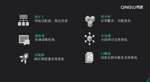 在本次推介會上,青鹿講師為大家詳細(xì)地介紹了無限課堂如何通過重塑智能化的教學(xué)環(huán)境實現(xiàn)信息化技術(shù)與教學(xué)融合。青鹿講師從當(dāng)前課堂信息化應(yīng)用的用不了、用不好、兼容差、互動難、實現(xiàn)弱以及門檻高等6大痛點展開分析,引起的現(xiàn)場觀眾的廣泛共鳴。
