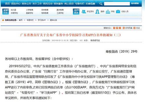 2019年8月29日,廣東省教育廳發布了《廣東省教育廳關于公布廣東省中小學校園學習類APP白名單的通知(三)》,青鹿智慧課堂成為最新一批過審白名單成員。