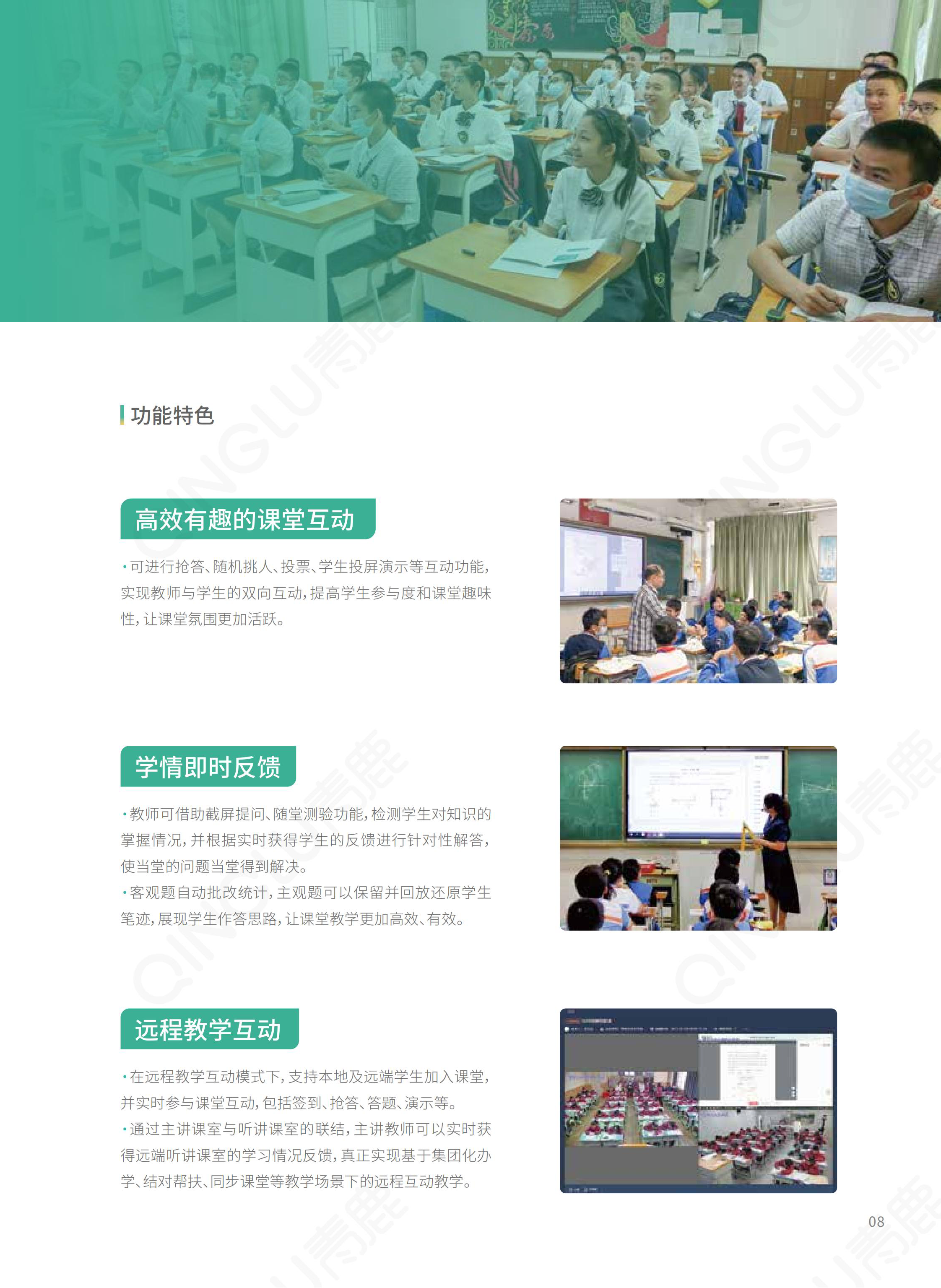 | 智慧教育信息化整體解決方案提供商,我們提供集智慧紙筆課堂、智慧錄播為一體的智慧教學(xué)環(huán)境,提供一套可廣泛應(yīng)用于K12學(xué)校信息化整體建設(shè)的開放式底層平臺(tái),為學(xué)校的教學(xué)和管理質(zhì)量提升提供支撐,賦能教育的數(shù)字化轉(zhuǎn)型。 |