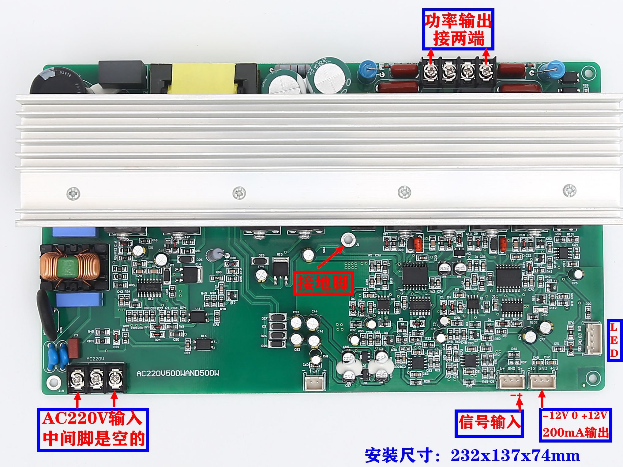 產(chǎn)品詳細(xì)介紹普寧市數(shù)字功放科技生產(chǎn)的XIAGUANGQU霞光曲品牌數(shù)字功放板,采用D類功放芯片和先進(jìn)的開關(guān)電源技術(shù),是我公司2018年開發(fā)生產(chǎn)的六代出口型帶電源單聲道數(shù)字功放一體組件,定阻輸出。具有性能穩(wěn)定、音質(zhì)優(yōu)美、信噪比高、全自動保護(hù),失真度低等特點。其功能可以滿足整機(jī)廠的要求,是開發(fā)新產(chǎn)品、升級產(chǎn)品、節(jié)約開發(fā)周期的理想配套產(chǎn)品。 特性指標(biāo) 高 效 率:93% 輸出功率:400W 500W 600W 可根據(jù)需要選擇其他功率 定阻輸出:4-8Ω  供電電壓:AC220V 頻 寬:20Hz-20KHz 輸入信號:0db 信 噪 比:86db 失 真 度:1KHz 0.1%  500w @4-8Ω 保護(hù)功能:短路保護(hù)、過流保護(hù)、高溫保護(hù) 輸入、輸出接口: 工作狀態(tài)LED顯示接口 (400W以上有)用于顯示工作、信號、自動保護(hù)狀態(tài) 指示。 12V200mA風(fēng)機(jī)電源輸出 用于外接散熱風(fēng)機(jī) + - 12V 200mA輸出 用于您或許需要配套的前級板電源。 智能風(fēng)機(jī)控制: 當(dāng)散熱器溫度上升到45度時,風(fēng)機(jī)開始工作。