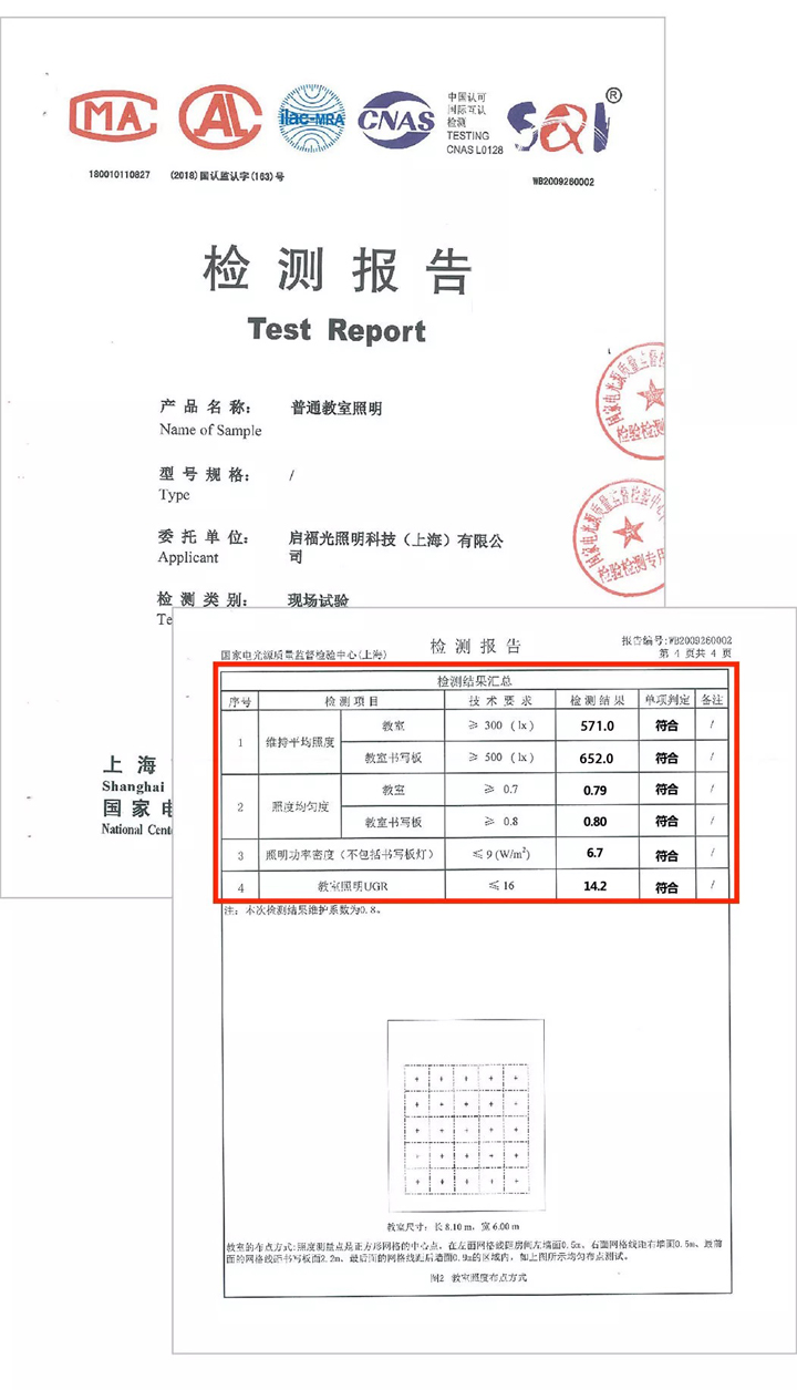 △教室改造后課桌照度為571Lx,黑板照度652Lx,優(yōu)于國家標(biāo)準(zhǔn),色溫4500K,減少眼疲勞,保護學(xué)生視力健康;