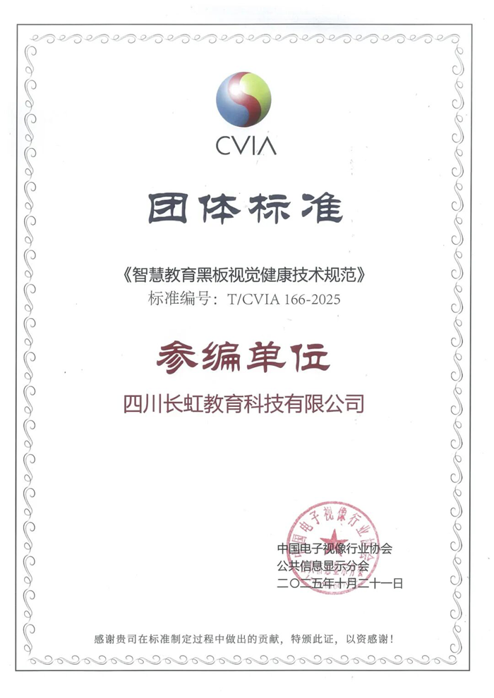 作為標準核心起草單位,長虹教育科技依托十余年教育裝備研發經驗,在防眩光設計、顯示性能優化、智慧護眼等關鍵環節提供實踐支撐,確保標準內容貼合真實教學場景。該標準的落地,對行業而言,將推動智慧教育黑板領域從“拼參數”向“重健康”轉型,為企業研發生產設立“健康標桿”;對學校而言,解決了采購時“選品難、判斷難”的痛點,提供清晰的視覺健康指標;最終將成為守護師生視力的“安全屏障”,為數字教育高質量發展注入“健康動能”。
