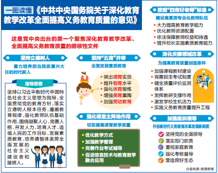 《中共中央國務院關(guān)于深化教育教學改革全面提高義務教育質(zhì)量的意見》(以下簡稱《意見》)近日印發(fā),這是中共中央、國務院印發(fā)的第一個聚焦義務教育階段教育教學改革的重要文件,是新時代我國深化教育教學改革、全面提高義務教育質(zhì)量的綱領性文件。