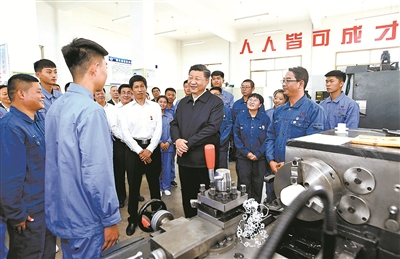 8月19日至22日,中共中央總書記、國家主席、中央軍委主席習近平在甘肅考察。這是20日下午,習近平在張掖市山丹培黎學校現代制造技術實訓室,觀看職業技能實訓,同師生親切交流。新華社記者 謝環馳 攝
