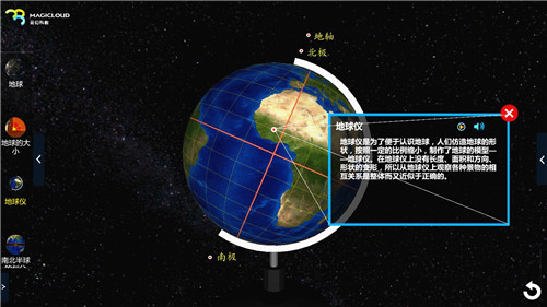 綜合運用3D立體圖、平面圖、語音等多種形式,直觀、詳細描述經(jīng)度、緯度、地球的自轉(zhuǎn)公轉(zhuǎn)、板塊、火山等地理知識,讓學(xué)生對全球地理知識有概況把握。
