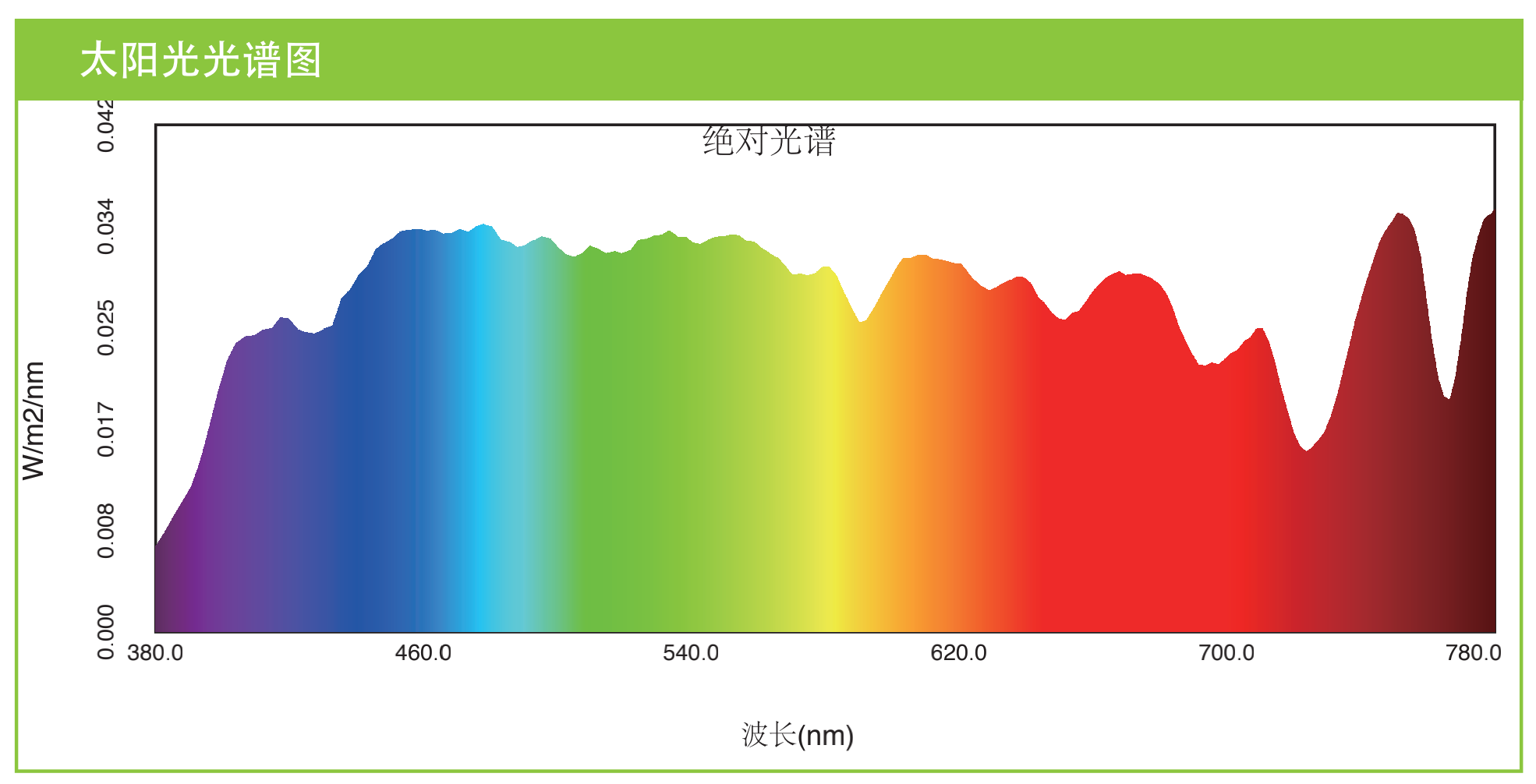 晴天中午的太陽光輻射連續(xù)光譜,色溫5000K,分為可見光與不可見光兩部分。可見光的波長為400~760 nm,分為紅、橙、黃、綠、青、藍(lán)、紫7色,集中起來為白光;不可見光兩種,波長大于760nm的紅外線以及波長290~400nm的紫外線。