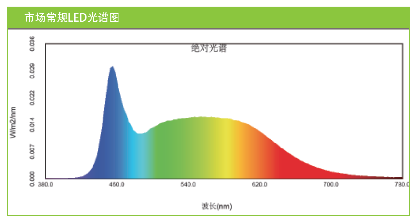 市場常規(guī)LED中普遍使用藍(lán)光芯片,藍(lán)光光譜相對較高,缺少紫光、青光、短波綠光和長波紅光部分。過量的藍(lán)光以及照明燈具的不當(dāng)使用會造成視覺損傷。藍(lán)色光線會抑制褪黑素的分泌,可能會導(dǎo)致失眠。
