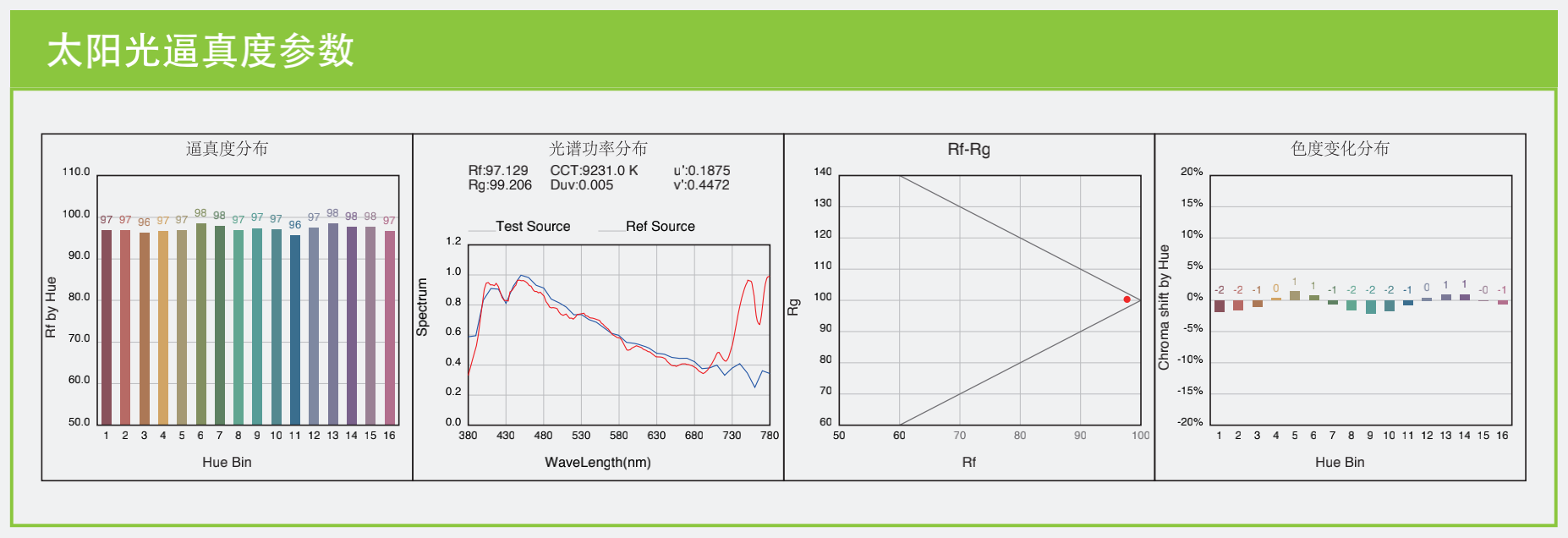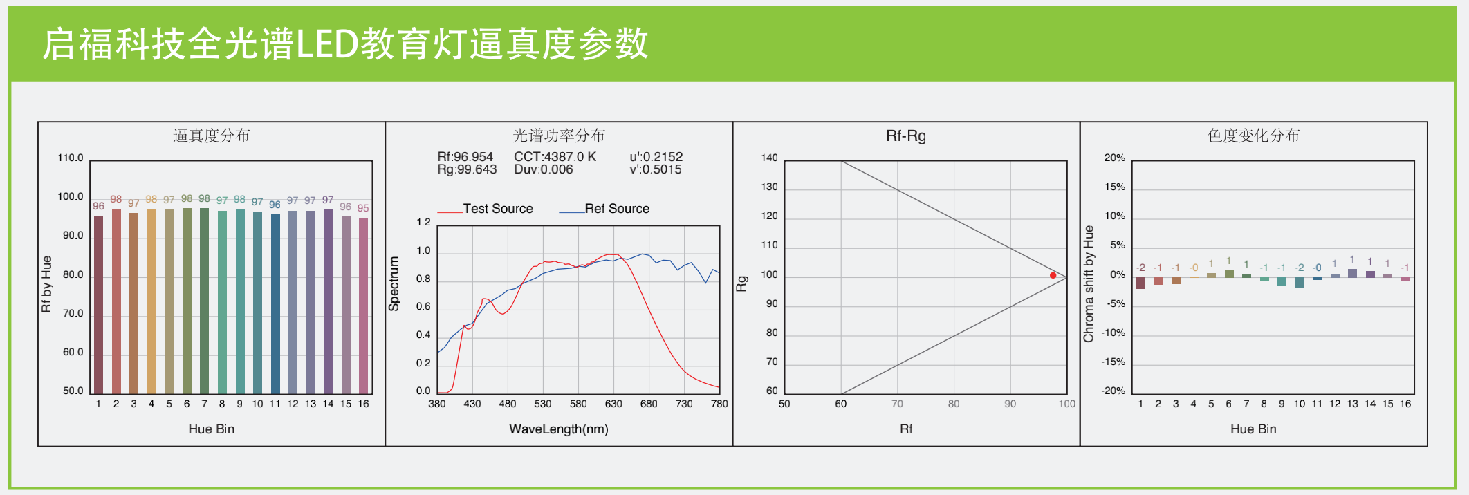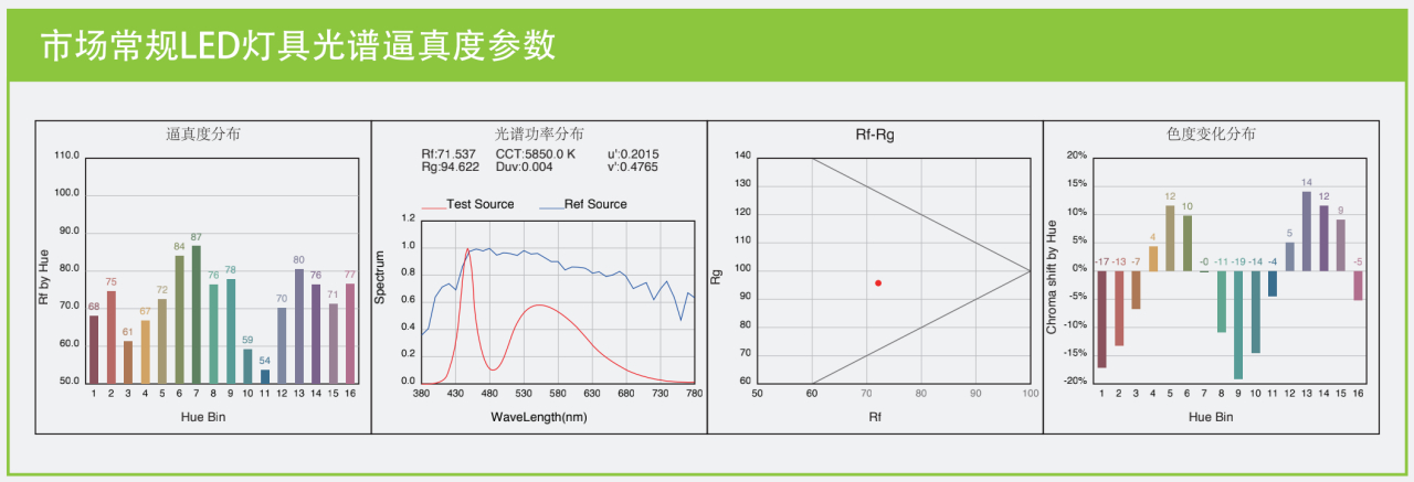 真正的全光譜健康照明系列LED燈具應(yīng)達(dá)到其顯色指數(shù)Ra97,色保真指數(shù)Rf96,色飽和度Rg接近100(IEC TM-30-15),同時實(shí)現(xiàn)高光效、高可靠性、低藍(lán)光、低紫光、無頻閃、無眩光、UGR不高于16的參數(shù)。