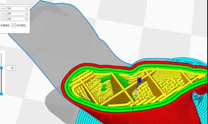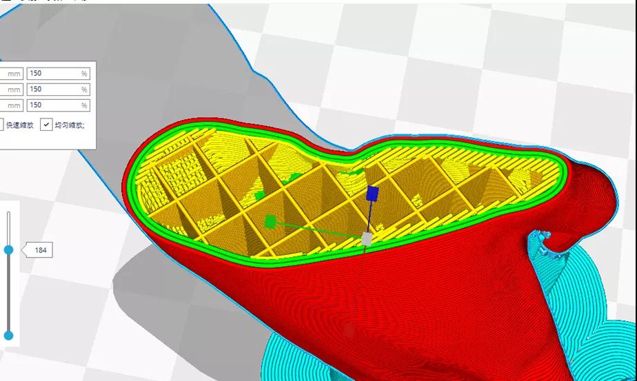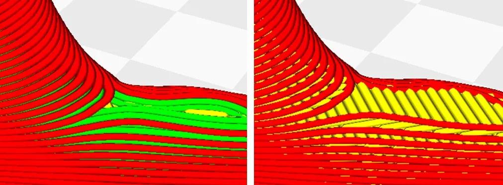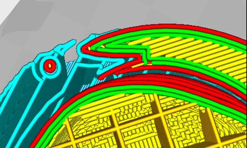 如下圖所示,在打印細節時,顯示紅色的外壁來負責還原細節,顯示綠色的內壁則負責形成殼體結構。