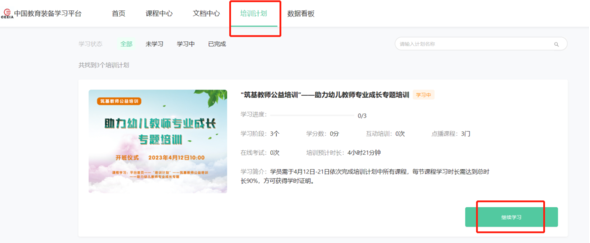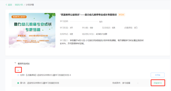 課程學(xué)習(xí):4月12日14:00—21日24:00,在平臺(tái)首頁(yè)——“培訓(xùn)計(jì)劃”,找到《“筑基教師公益培訓(xùn)”——助力幼兒教師專業(yè)成長(zhǎng)》計(jì)劃,點(diǎn)擊“開(kāi)始學(xué)習(xí)”進(jìn)入計(jì)劃,依次學(xué)習(xí)課程。
