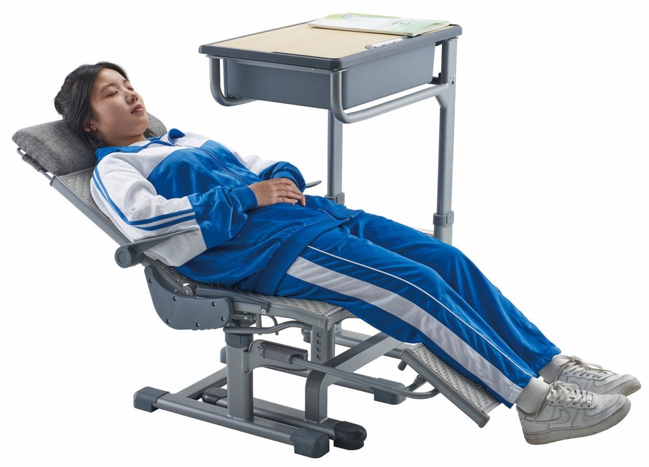 產品在研發(fā)時充分考慮到教室空間的利用率,將課椅椅腳進行延長保證穩(wěn)固性,午休時將課椅向前移動,將桌面搖高到午休高度,充分利用課桌下方的可用空間和前位椅下的空間,并且讓平躺午休更加舒適安全。