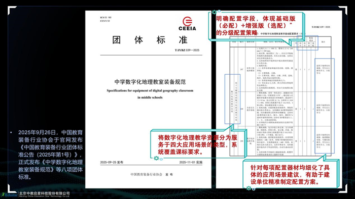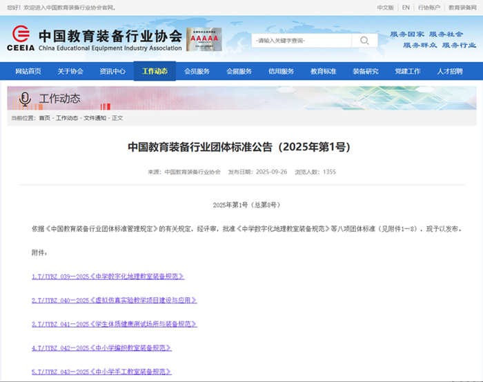 2025年9月26日,中國教育裝備行業協會于官網發布《中國教育裝備行業團體標準公告(2025年第1號)》,正式發布《中學數字化地理教室裝備規范》等八項團體標準。