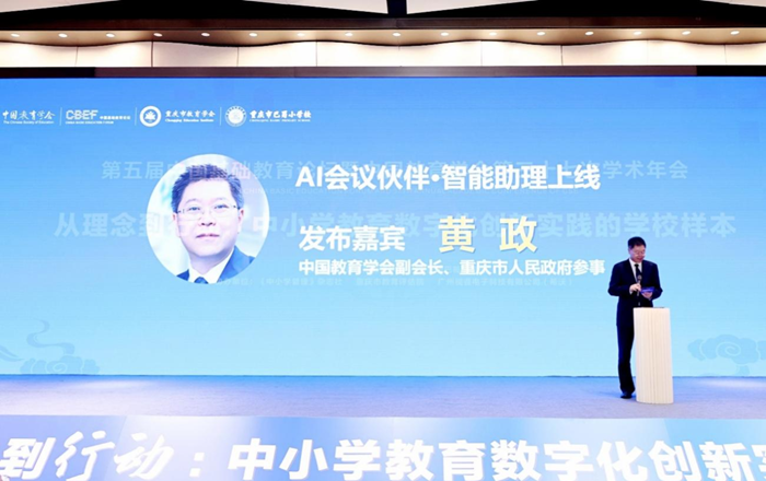 中國教育學會副會長、重慶市人民政府參事黃政在會上啟動了“AI會議伙伴·智能助理”,讓與會者親身體驗互動共創、人機協同的全新參會模式。