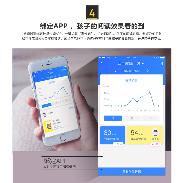 9.家長端APP系統(tǒng):實(shí)時(shí)查看孩子閱讀報(bào)告;實(shí)時(shí)查看孩子作業(yè)報(bào)告;實(shí)時(shí)掌握孩子社圈交流情況反饋;學(xué)生端家長管控功能;書城功能,與孩子共同閱讀。