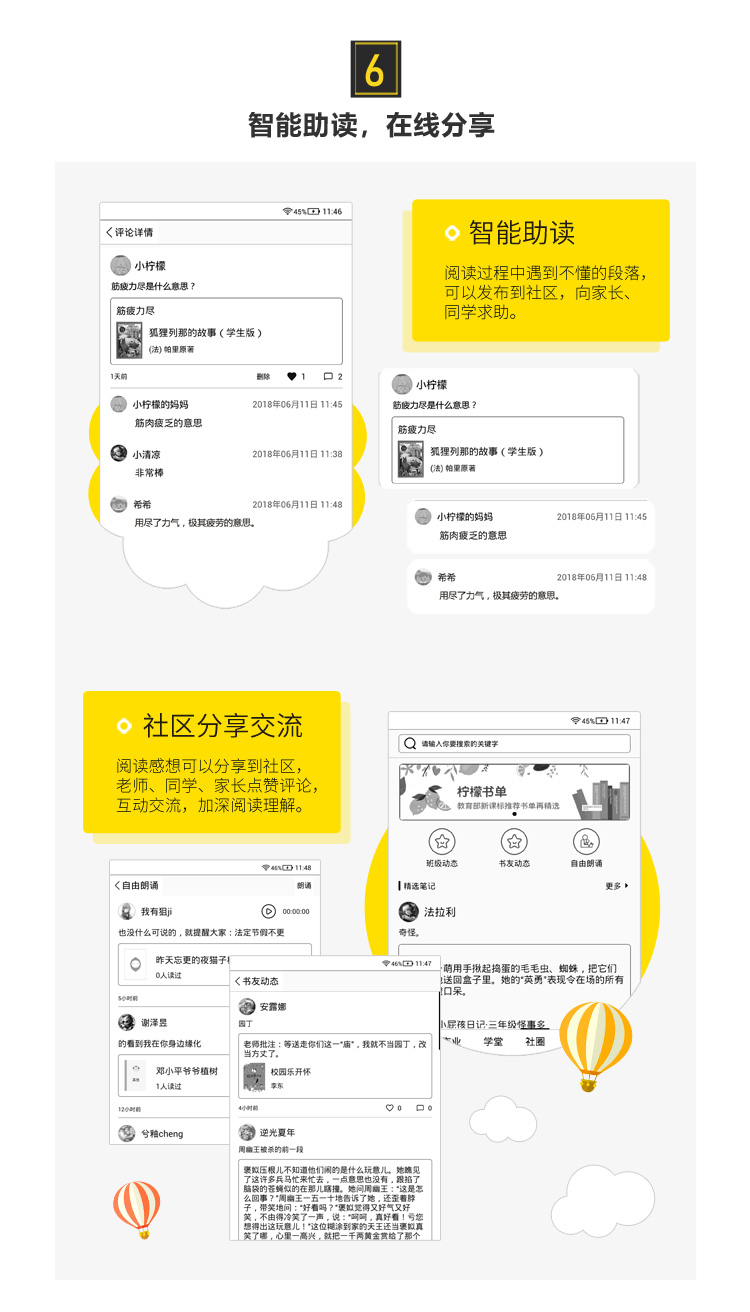 5.智能分級(jí)互動(dòng)模塊:書籍簡介評(píng)論中點(diǎn)贊互動(dòng);班級(jí)動(dòng)態(tài)中與同班同學(xué)交流互動(dòng);書友動(dòng)態(tài)中與看過同樣書籍的書友交流互動(dòng);自由朗誦中對(duì)朗動(dòng)錄音點(diǎn)贊評(píng)論