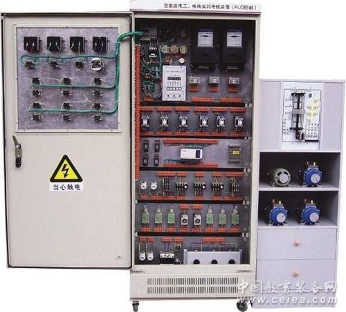 該裝置按標準電氣控制柜設計制造規格,充分利用雙面位置,柜內裝有完成各種照明電路所需的單相電度表、日光燈、單聯開關、插座、感應開關、漏電開關等,以及電氣控制所需要的多種低壓電器,如漏電斷路器、熔斷器、電流互感器、交流接觸器、時間繼電器、熱繼電器、中間繼電器、行程開關、按鈕、信號燈、轉換開關、電壓表、電流表、功率表及電度表等,為了延長電器使用壽命,各電器的接點都與接線端子相連,再由接線端子與被控制電氣連接。