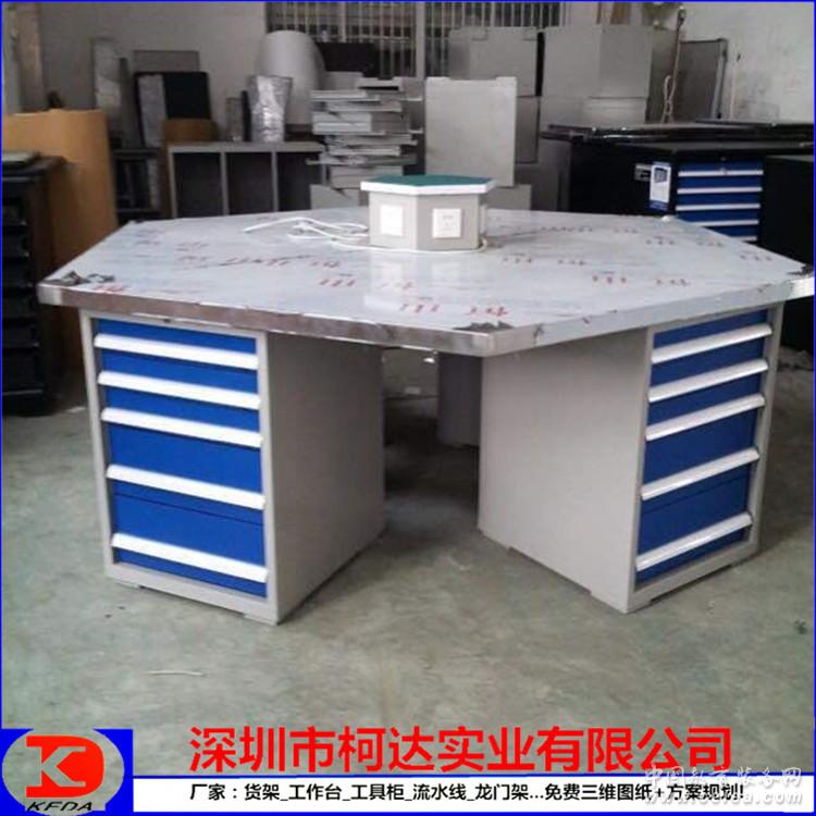 7。六角鉗工臺的邊長寬度和臺面高度多少比較合理? 按照人機工程學(xué)原理,標(biāo)準(zhǔn)高度為800mm,單邊長1.2米,直徑2.4米,適合中國工人的身高和工作效率。