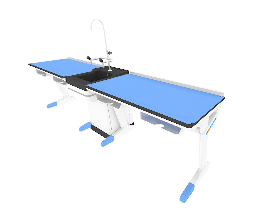洗滌池主框架:采用特制型材(大水槽、中水槽),框架轉角采用模具件接插,表面耐化學試劑的環氧樹脂靜電粉沫噴涂,臺面威盛亞理化板,邊緣雙層加厚。.