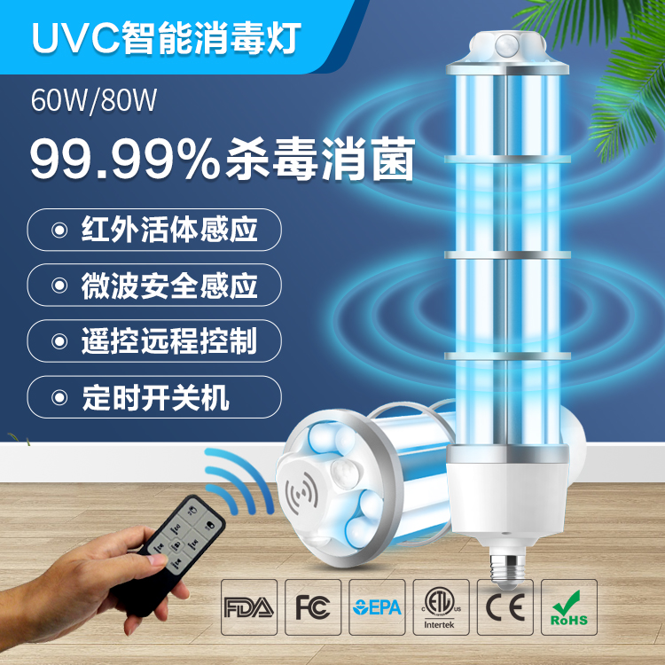 產品詳細介紹 應用范圍: 醫院/學校/商場/公共場所 功率:80W 輸入電壓:220-240V 燈管類型:UVC 波長:254nm 接口: E27/E40 安裝:掛環/三角支架 控制器:無線控制 時間:30/60/90/120 分鐘 傳感器:微波感應+ 3個紅外感應 尺寸:D94XL422mm 認證:ETL FCC FDA CE |