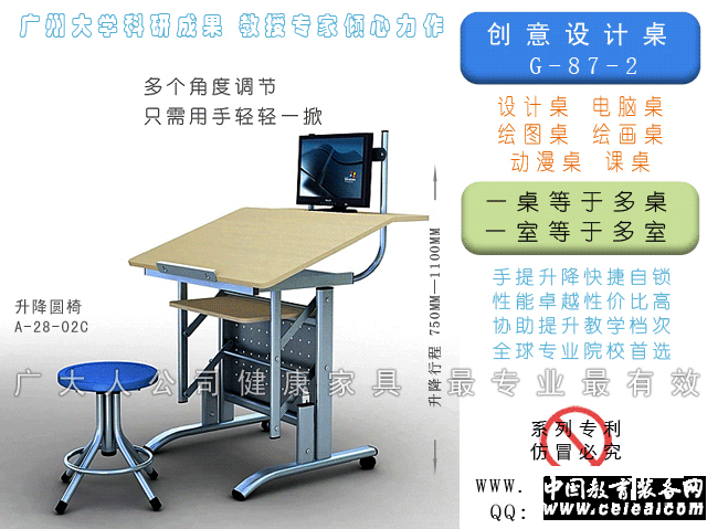 創(chuàng)意設(shè)計(jì)桌 多功能升降,一桌等于多桌: 普通書桌、繪畫,設(shè)計(jì)桌,一間課室等于多間課室。 ·作普通書桌:可微調(diào)高度角度,預(yù)防近視、腰椎病和頸椎病。 ·特殊書桌:可站立學(xué)習(xí)和工作,回復(fù)人體脊椎和呼吸的自然狀態(tài),預(yù)防肥胖和痔瘡。 ·作繪畫桌、設(shè)計(jì)桌:可調(diào)任意角度,可調(diào)節(jié)多個(gè)高度,可疊加大圖板;無需電源,價(jià)格低廉。 CREATIVITY TABLE Multifunctional movement,One desk has more functions: common desk, rawing table,designingtable. One classroom had three functions. ·As general desk :The height and the angle can be adjust,prevent from short sight , lumbar and neck hurt . ·As special desk :Can study and work at stand pose, and make your chine release, prevent illness . ·As design table :The angle and the height can be adjust ,and attach a big size board. No power needed ,low price.